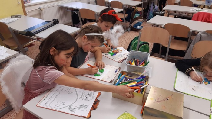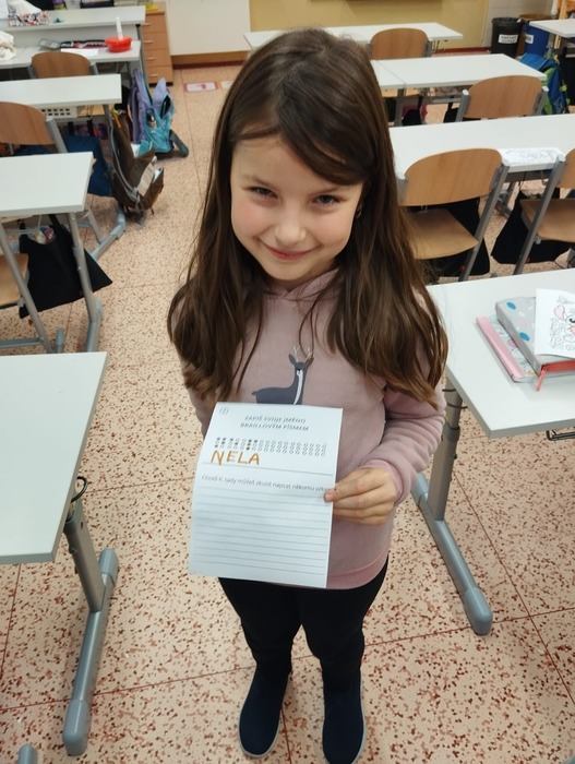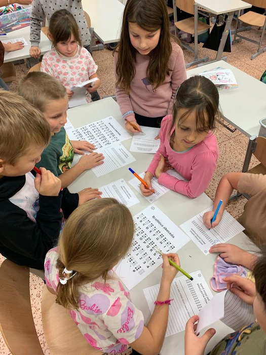 V listopadu jsme si mimo jiné povídali o svatém Martinovi. Děti se seznámily s jeho příběhem a poté si ho vyrobily netradičním a velmi zajímavým způsobem – pomocí křídy. Vznikla tak krásná výtvarná díla, která zdobila naši družinu. V tomto měsíci jsme si také připomněli Den nevidomých. Děti si vyzkoušely, jaké je to fungovat bez zraku, a zkusily si napsat svá jména v Braillově písmu. Pro mnohé to byla zcela nová zkušenost, která jim pomohla lépe pochopit svět lidí se zrakovým postižením.